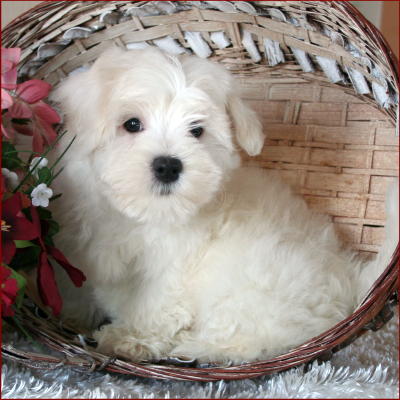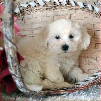 What are the Bichon Maltese or Maltichon dogs like? The Bichon Maltese or Maltichon puppy combines the outstanding characteristics of the Bichon Frise and the Maltese Breeds. The Maltichon is a mix between a Bichon Frise and a Maltese. It is an independent dog, is intelligent and very affectionate. This gentle dog does not bark constantly. It has a self-assured, happy temperament that is easy to live with. Maltichons are easy to train and love everyone. They need people to be happy. They are naturally sociable and are happiest when they are part of a family that takes them everywhere. This sociable trait also means that they are fine in the company of other dogs & pets and are excellent with children. Used as watchdogs and to perform tricks, this breed is competitive and obedient. Height: 9-12 inches Weight: 7-12 pounds Since Maltichons have hair instead of fur, they don’t shed, which makes them wonderful for allergy suffers. They enjoy being brushed daily. Because of it’s size, the Maltichon is perfect for apartments and RV’s. They love to go everywhere with you. As Bichon Maltese breeders, it is our goal to raise happy, healthy Bichon Maltese or Maltichon puppies that will fill the spot of best friend to their new owners. -------------------------------------------------------------------------------- As you look through the photos on different breeders websites, one might notice that the look of the Maltichon can vary widely, based on the quality of their parents. The Maltichon puppies shown are typical of what you will find with one of our Rolling Meadows puppies. They are the product of careful, thoughtful breeding. We are committed to breeding a healthy, sweet tempered Maltichon who is also cute! Our puppies are from Bichon Frise and Maltese purebreds who are AKC registered and have some Champion bloodlines in their pedigrees. ____________________________________________ What will my Bichon Maltese look like as an adult? As the Bichon Maltese puppies becomes an adult, their appearance does not change much. They retain their puppy look throughout adulthood and will retain much of their puppy color pattern. Their hair will continue to grow (since they are non-shedding) and will need to be trimmed in a puppy cut if you like the shorter haired look. The puppies will usually stay the same colorr as they mature. Though the adult look of a Bichon Maltese can be harder to predict that the appearance of a purebred Bichon or Maltese they always end up looking cute as a button:) The average adult weight of our puppies will be 7-12 pounds. |