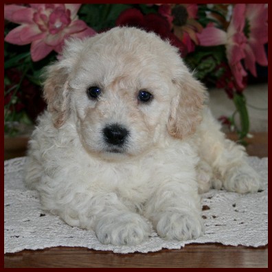 | What is the Bichon Poodle, Bich poo or Poochon dogs like? The Bichon Poodle, Bich poo or Poochon puppy combines the outstanding characteristics of the Bichon Frise and the Toy or Mini Poodle Breeds. Bichon Characteristics: Gentle mannered, sensitive, playful and affectionate. Bichons are extremely intelligent and adaptive with unique personalities and make the ideal companion for all ages, especially kids and even other animals! Bichons are full of love to give and life to live! A cheerful attitude is the hallmark of the breed. They are hypo-allergenic and do not shed, so need regular grooming. The Sweet Natured Bichon with its self-assured, important manner could fit into any home where a dog with a lot of love and loyalty is desired. Toy or Mini Poodle Characteristics: Proud and dignified, with elegant carriage, the Toy or Mini Poodle dog breed is intelligent and full of liveliness and perkiness. The Toy or Mini Poodle has an athletic history in its genes, having been bred from working retriever stock, and it moves with a springy, effortless gait. The Toy or Mini Poodle is eager to please and easy to train. Their coat which is hypo-allergenic non- shedding requires brushing twice a week and clipping every two months. Toy or Mini Poodles are a good tempered breed and are devoted to their families. Affectionate with their owners. As Bichon Poodle breeders, it is our goal to raise happy, healthy Bichon Poodle, Bichpoo or Poochon puppies that will fill the spot of best friend to their new owners. -------------------------------------------------------------------------------- As you look through the photos on different breeders websites, one might notice that the look of the Poochon can vary widely, based on the quality of their parents. The Poochon puppies shown below are typical of what you will find with one of our Rolling Meadows puppies. They are the product of careful, thoughtful breeding. We are committed to breeding a healthy, sweet tempered Poochon who is also cute! Our puppies are from Bichon Frise and Toy Poodle purebreds who are AKC registered and have some Champion bloodlines in their pedigrees. ____________________________________________ What will my Bichon Poodle look like as an adult? As the Bichon Poodle puppies becomes an adult, their appearance does not change much. They retain their puppy look throughout adulthood and will retain much of their puppy color pattern. Their hair will continue to grow (since they are non-shedding) and will need to be trimmed in a puppy cut if you like the shorter haired look. The Apricot/White puppies will usually lighten some in color as they get older. A puppy with black markings may turn lighter or stay black as they get older. The Dark Carmel Color will fade lighter as the puppy matures. The darker Apricot puppies normally stay darker as they mature. Though the adult look of a Bichon Poodle can be harder to predict that the appearance of a purebred Bichon or Toy or Mini Poodle, they always end up looking cute as a button:) The average adult weight of the featured puppies will be 12-18 pounds. The photos shown below are of our previous litters of Bichon Poodle, Bichpoo or Poochon puppies. These Poochon Puppies are not for sale, as they are already in the homes of their forever families. |